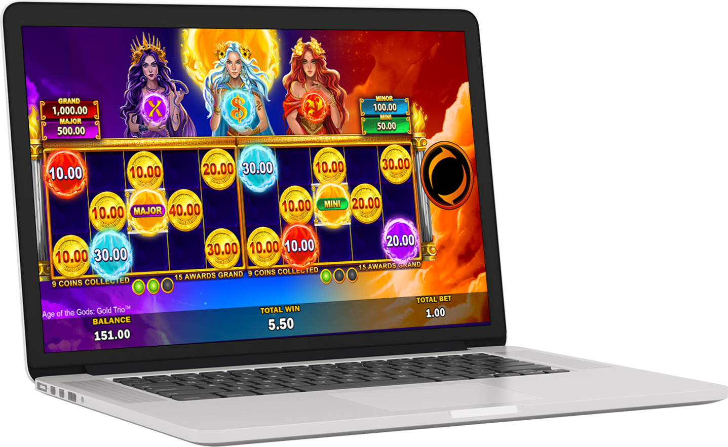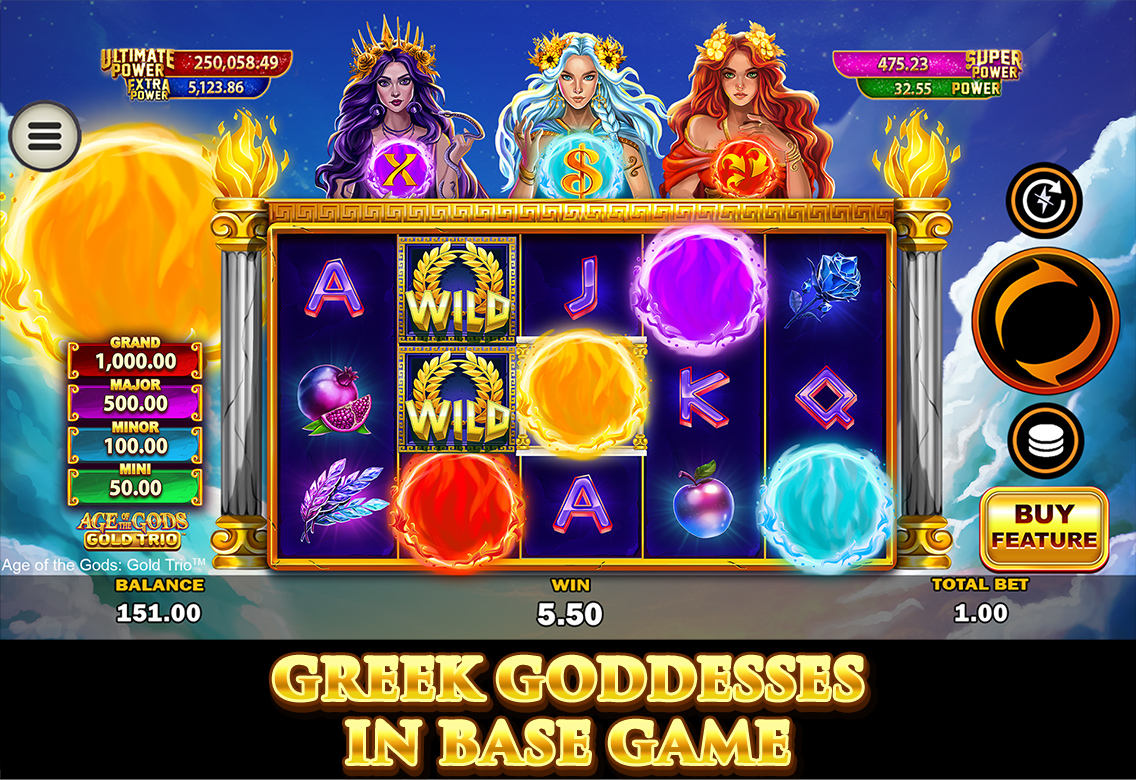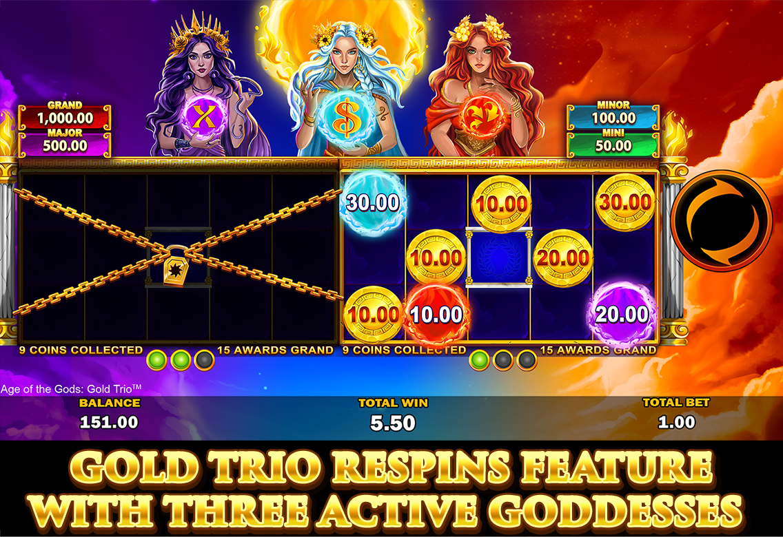 Land the coloured coin of the respective goddess to enlarge her sphere of energy. The more energy a Goddess has, the more likely she is to trigger Gold Trio™ Respins and bestow a boon, such as multipliers, accumulating prizes in view or extra prizes. Things heat up when the sun coin lands in the hot zone – the reels double in size to allow for even more prizes to land, while the sun reveals a Major, Minor or Mini Prize!