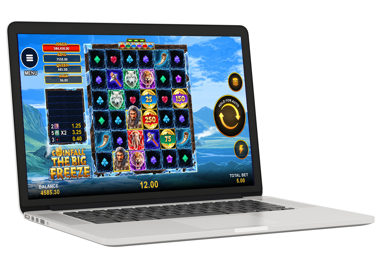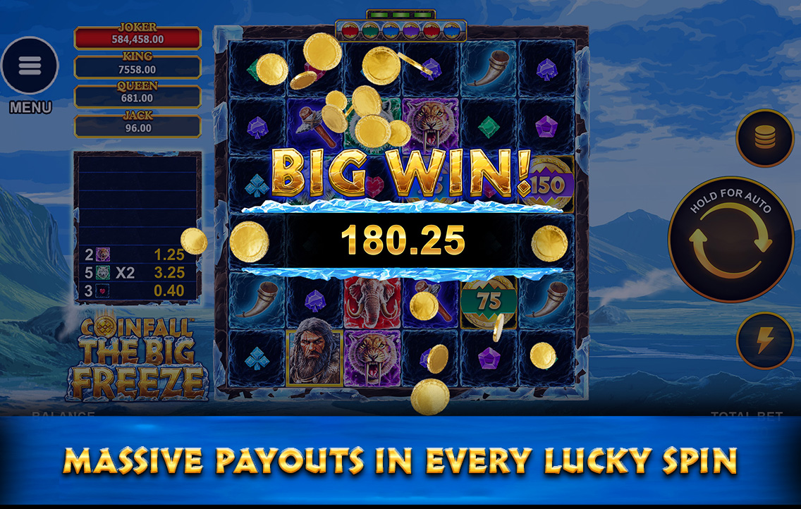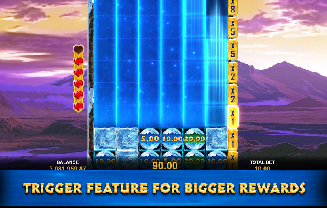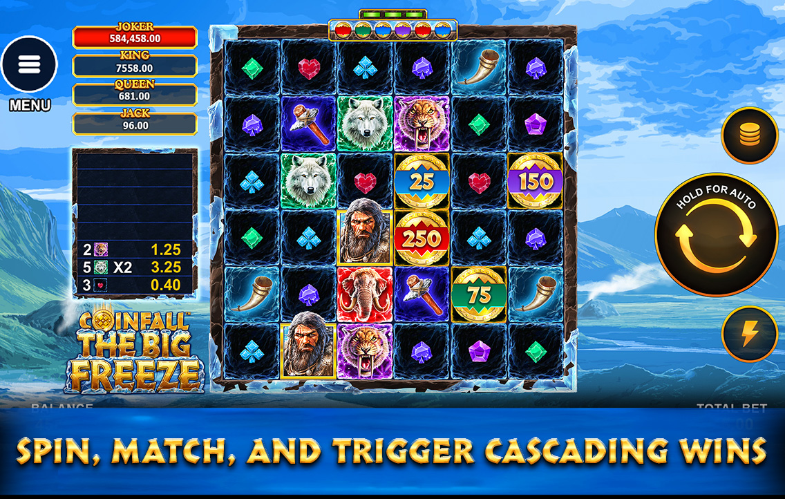 Return to the Ice Age, where up to six coins nestle above the reels, waiting for the fourth consecutive cascade to thaw the ice, release the coins into view, and award the values shown.