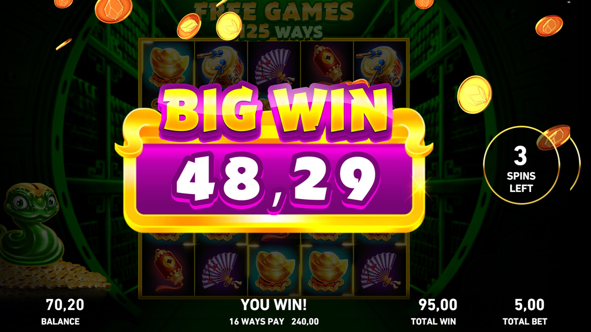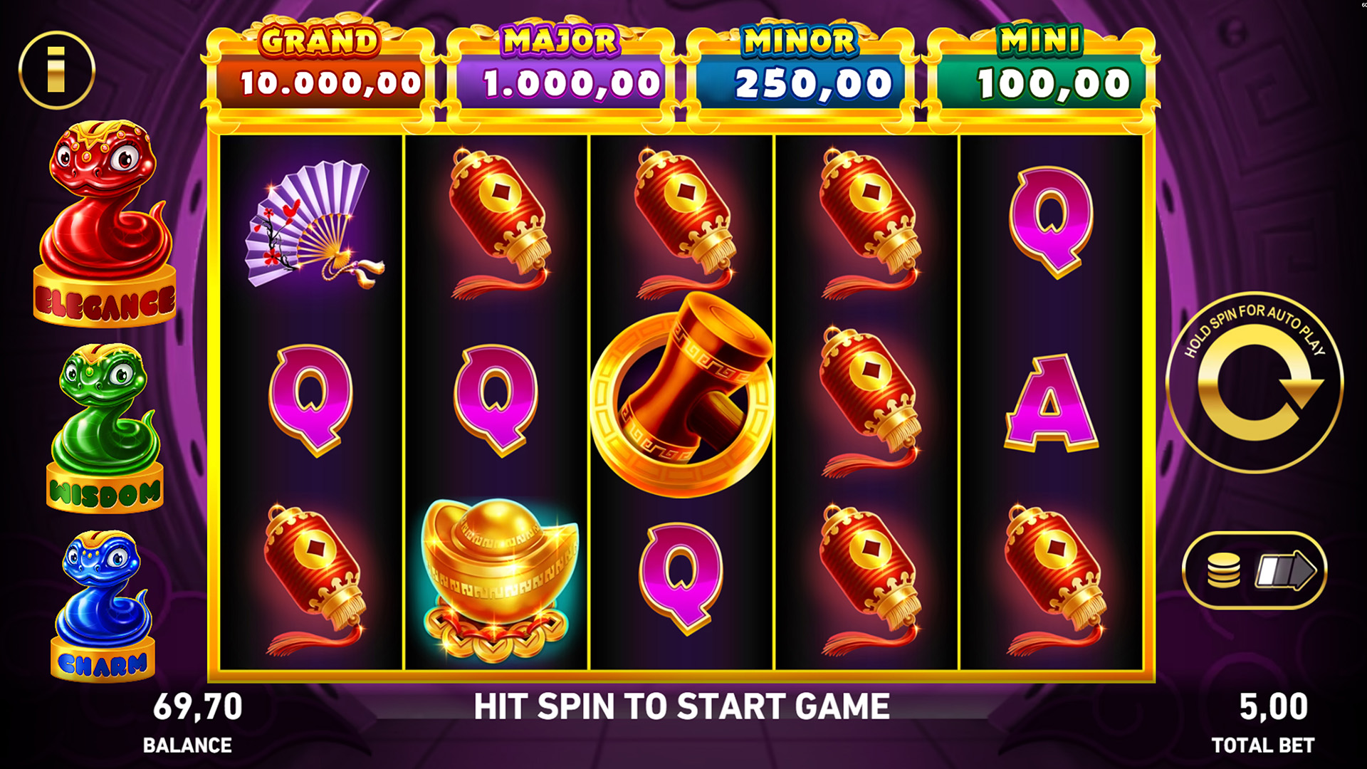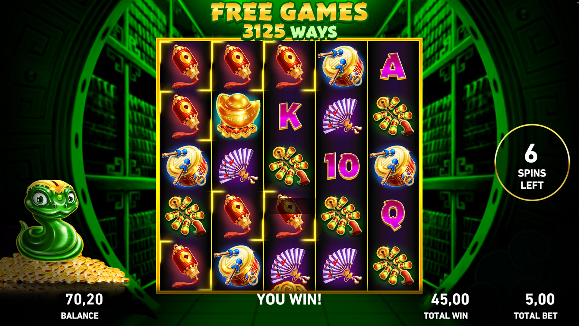Ring in year of the snake in this 243-way slot. Each snake brings a unique thrill! The Red Snake triggers the Match 3 feature, where the Mini, Minor, Major or Grand MUST be won. The Green Snake awards free games with expanding reels and extra ways to win. Finally, the Blue Snake will spin the Prize Wheel for your chance to win cash prizes worth up to 120X or two other snake features.