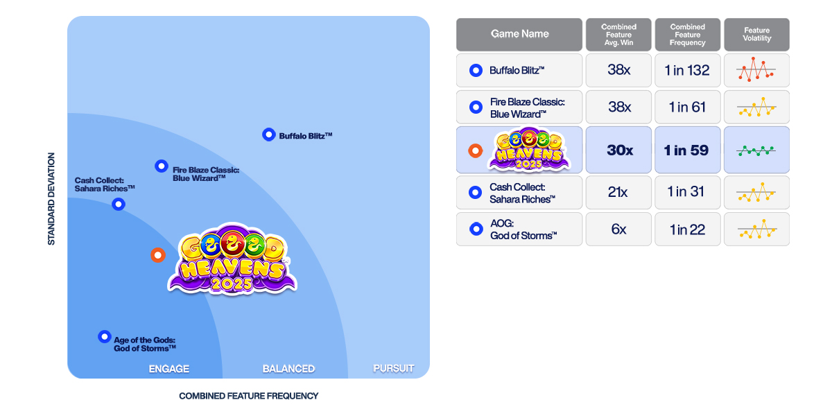 Lower volatility games offering smaller, but more regular wins, with a range of and/or frequently triggering features. These games are typically acquisition titles, designed to create variety and excitement for new players.