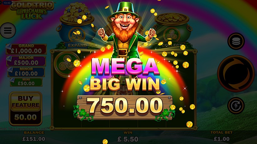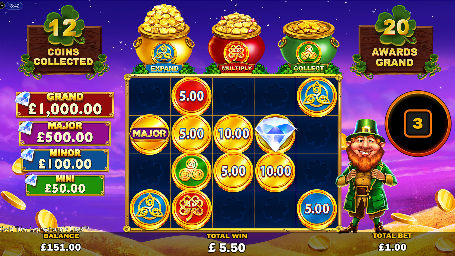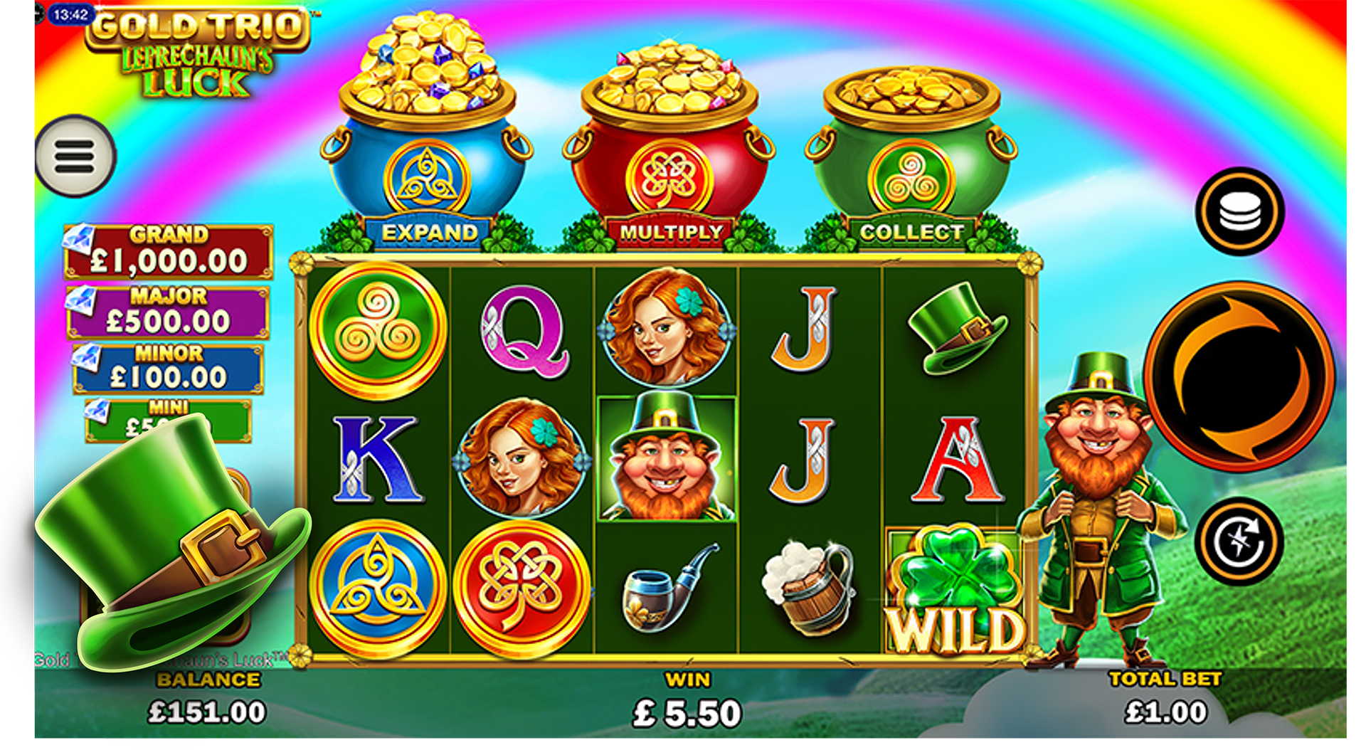 During Respins, coloured coins multiply and accumulate cash prizes or add extra rows to the reels, while the leprechaun improves cash prize values or transforms them into coloured coins. Lock as many coins as possible, unlock the other pots and win all prizes in view at the end of the feature. Fill the reels with coins in Respins to win the Grand prize.