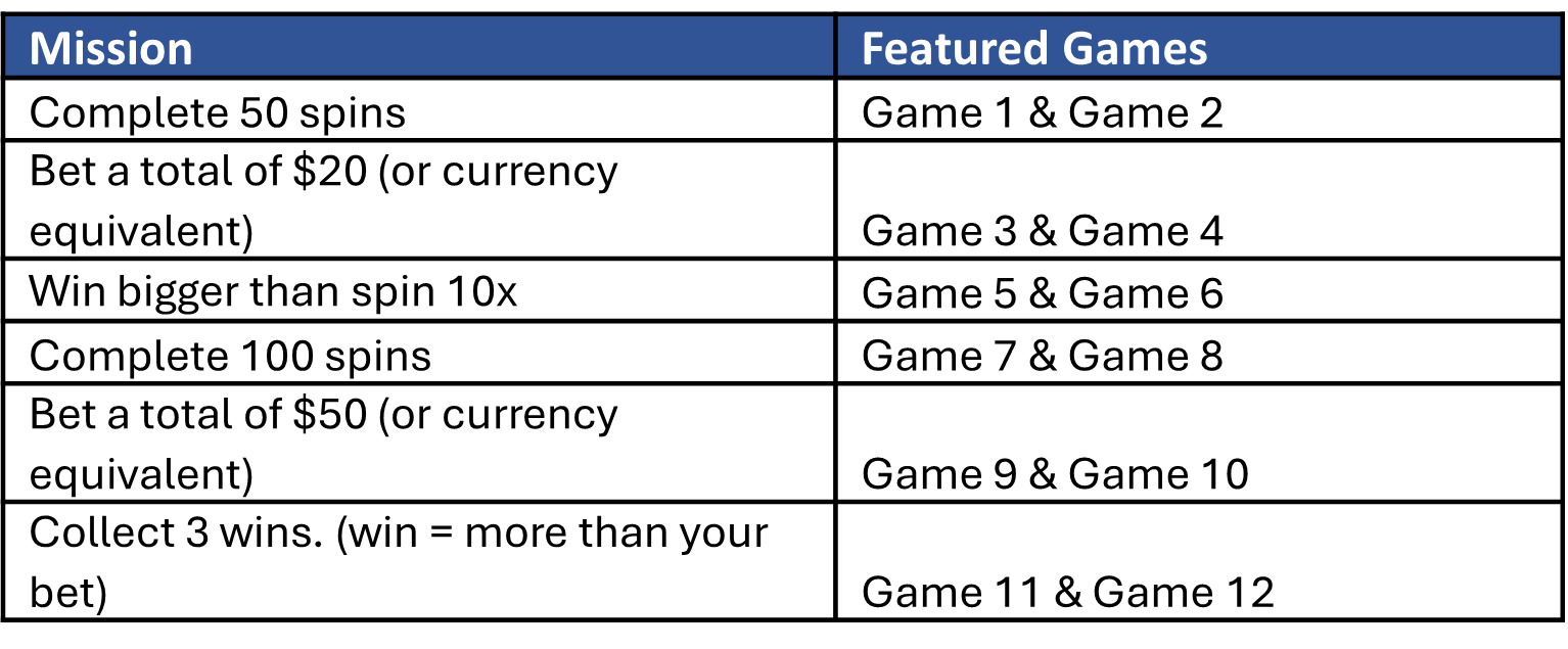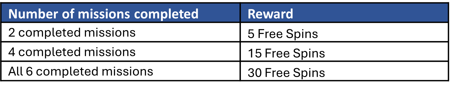 How it works: 6 missions to complete. For every 2 missions completed, a prize will be rewarded. All Missions can be completed in any sequence. Players can earn up to 50 Free Spins!