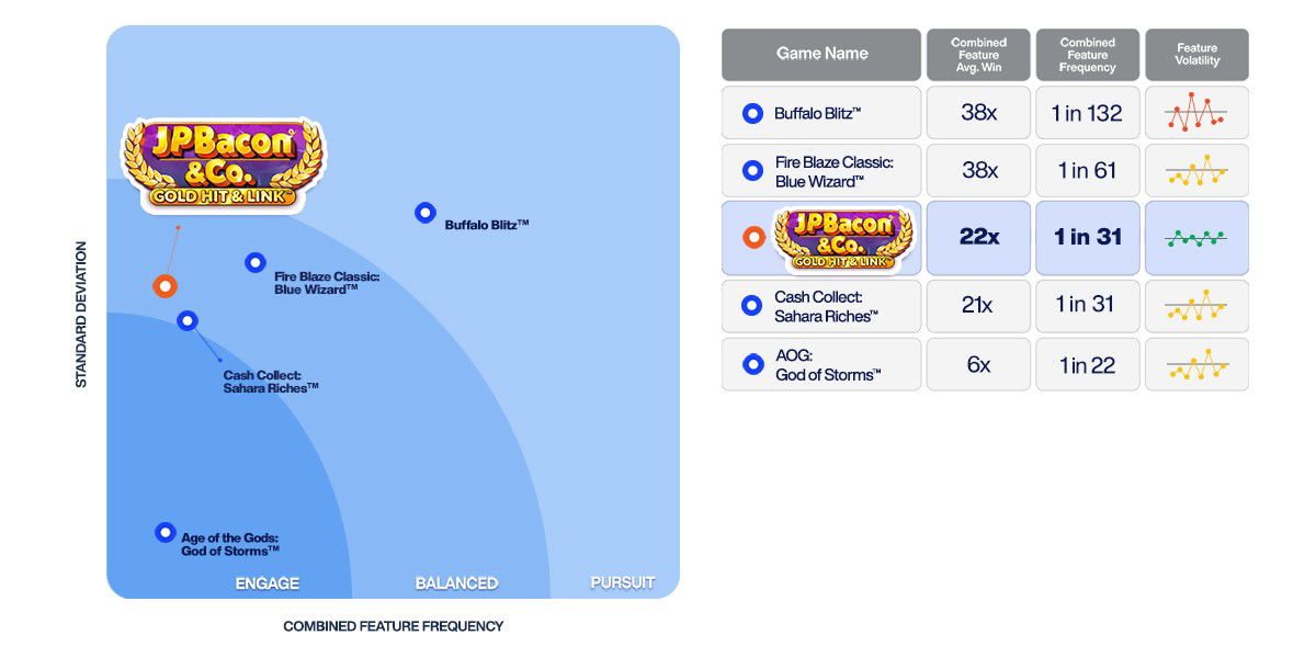 Lower volatility games offering smaller, but more regular wins, with a range of and/or frequently triggering features. These games are typically acquisition titles, designed to create variety and excitement for new players.