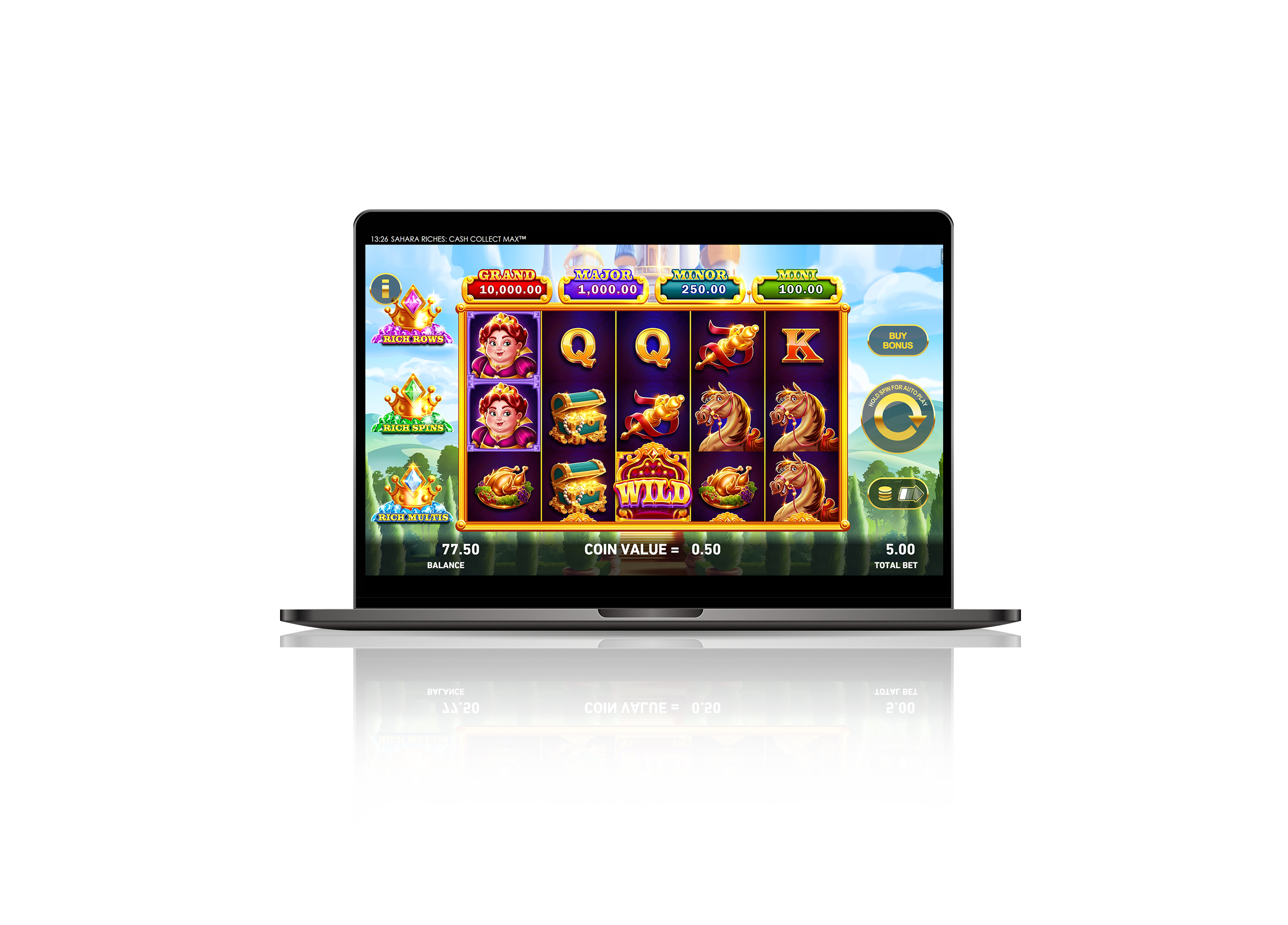 In the King Richwin Bonus, the royal Mega symbol instantly collects prizes and can grow to become king-sized and claim even more. Trigger the bonus with different crowns for different effects – the Pink Crown expands the reels up to eight rows high, the Green Crown adds extra spins, and the Blue Crown boosts prizes with powerful multipliers!