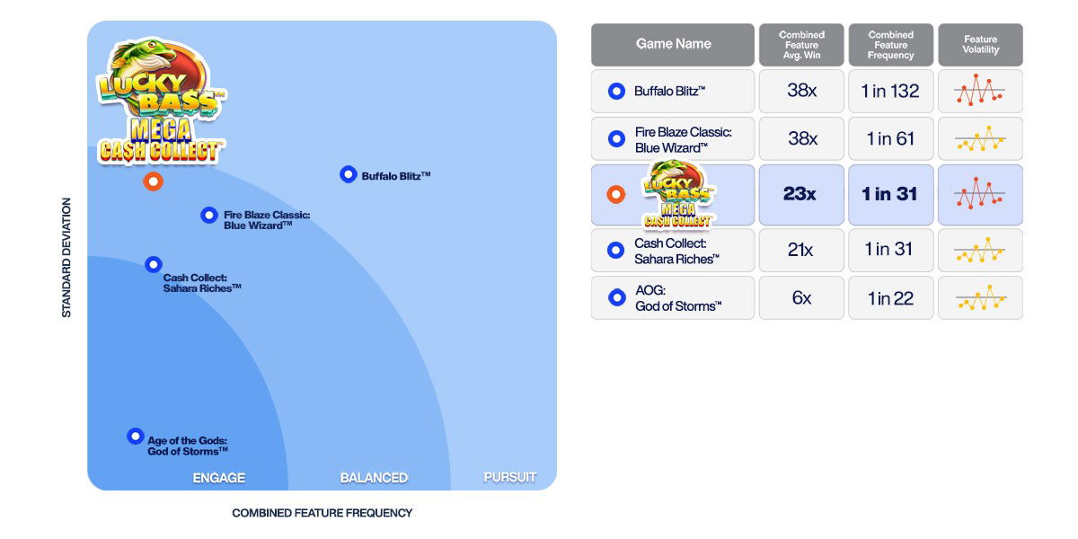 Lower volatility games offering smaller, but more regular wins, with a range of and/or frequently triggering features. These games are typically acquisition titles, designed to create variety and excitement for new players.
