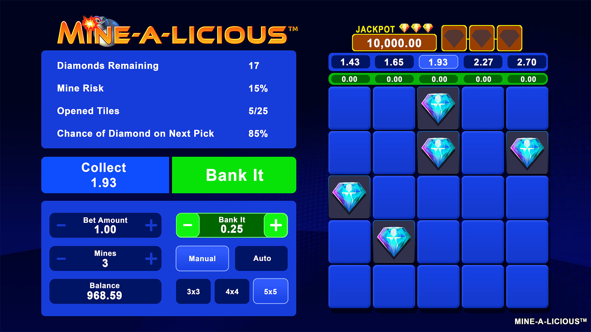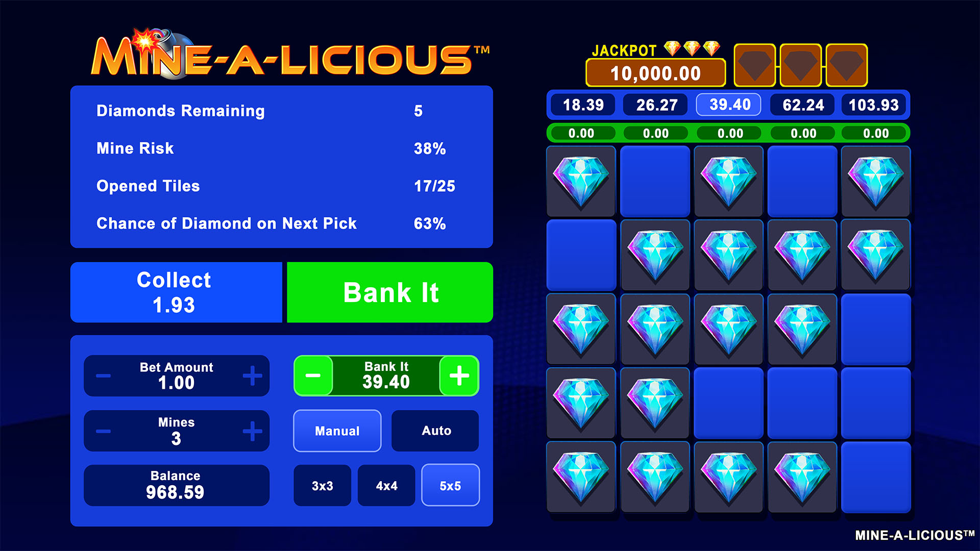 Select the number of hidden mines and then flip tiles to reveal diamonds that award prizes. Utilise the Bank It feature at any time to protect winnings. Reveal a GOLD diamond for a jackpot chance. Game ends when collect is pressed or a Mine is revealed.