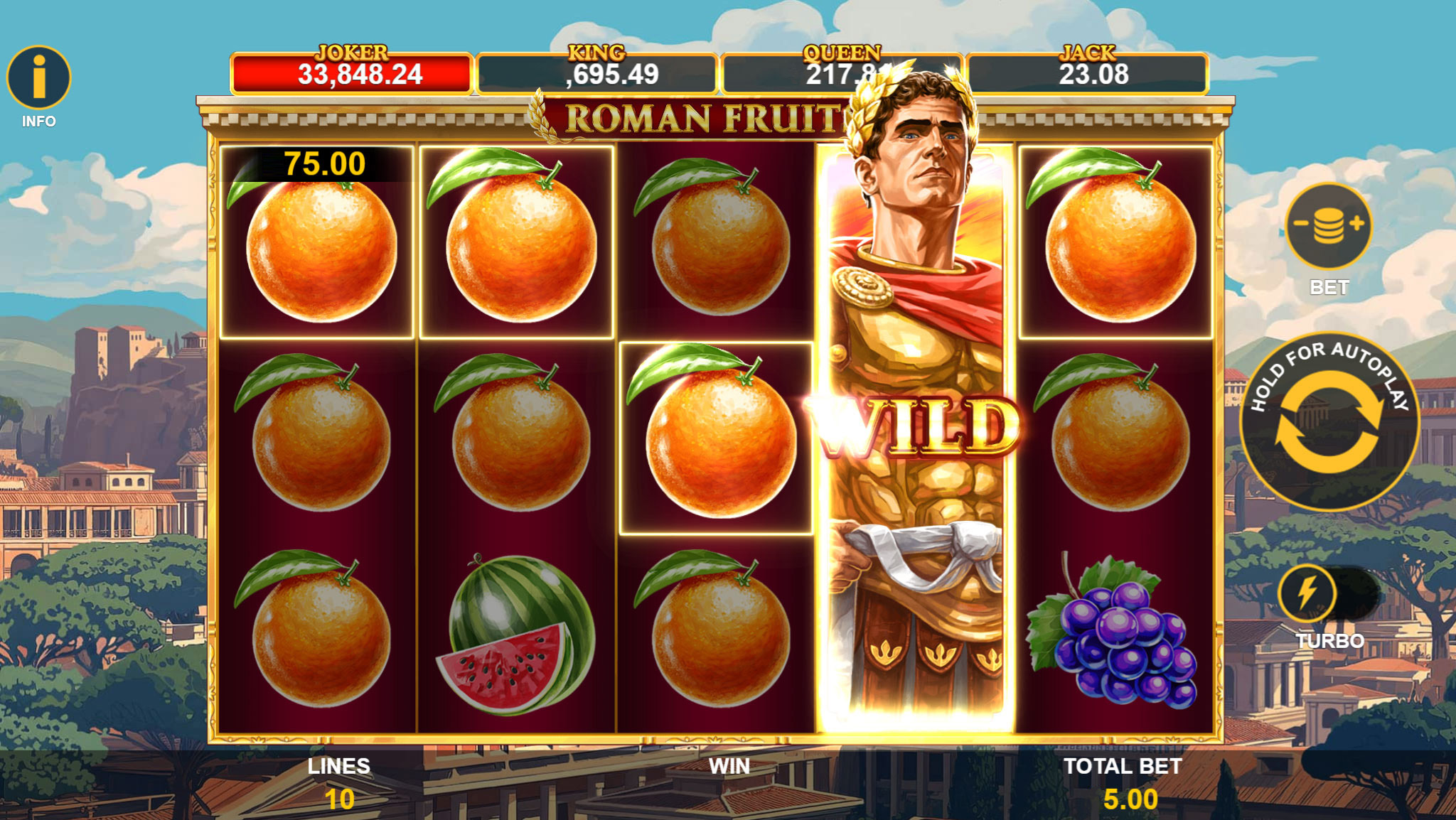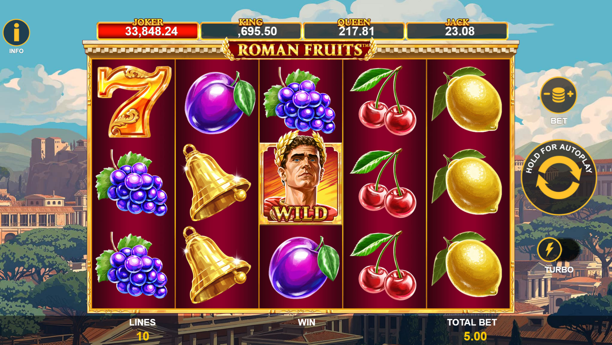 Roman Fruits is a timeless fruit-themed slot infused with Roman splendour. The core mechanics offer an exciting expanding Wild that covers the entire reel, two engaging Scatters, and the new four-level Joker Flip progressive Jackpot.