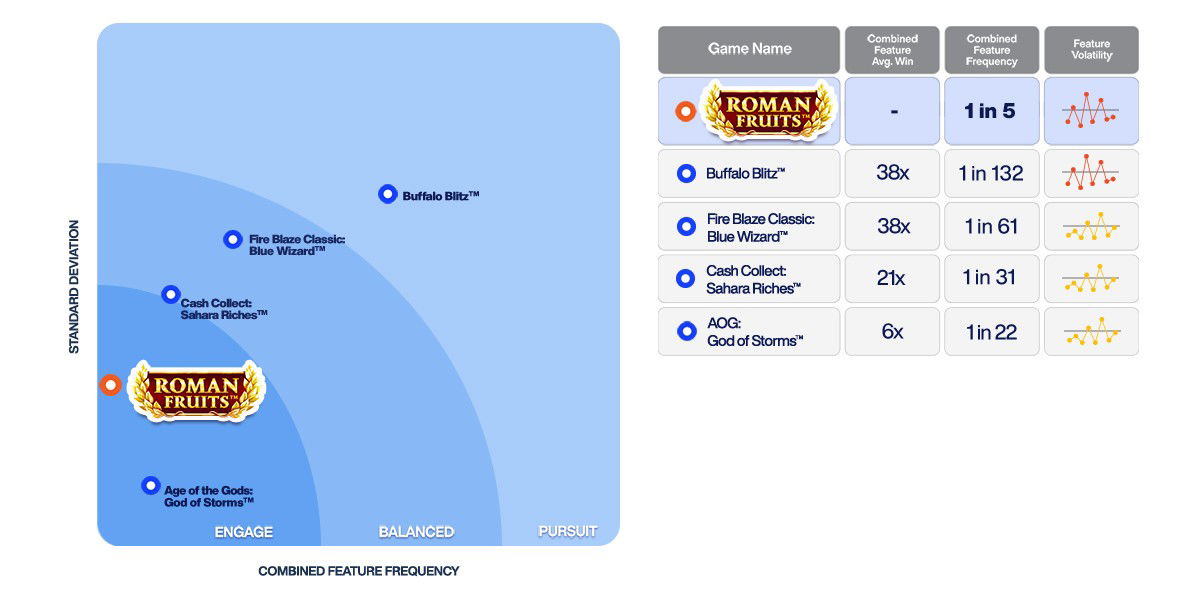 Lower volatility games offering smaller, but more regular wins, with a range of and/or frequently triggering features. These games are typically acquisition titles, designed to create variety and excitement for new players.