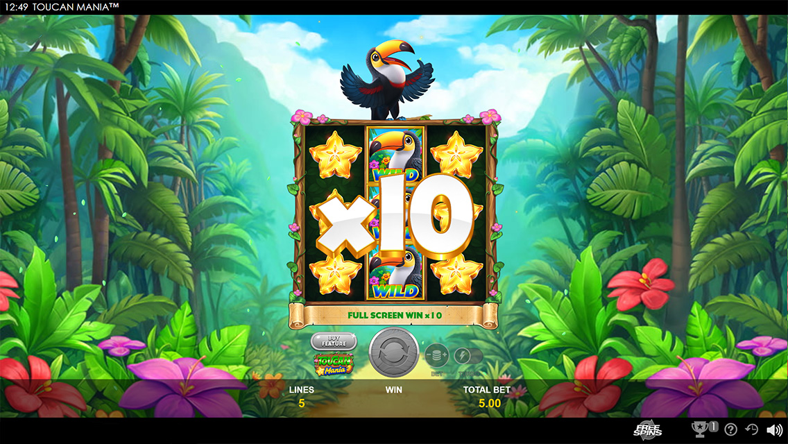 The festive toucan is part of the on-reels action, dancing and reacting to all game events while collecting energy from Wild symbols. The toucan can trigger the Respin Mania feature on any spin; selected symbols are held in place, increasing the chance to fill the screen and multiply the win win by X10.