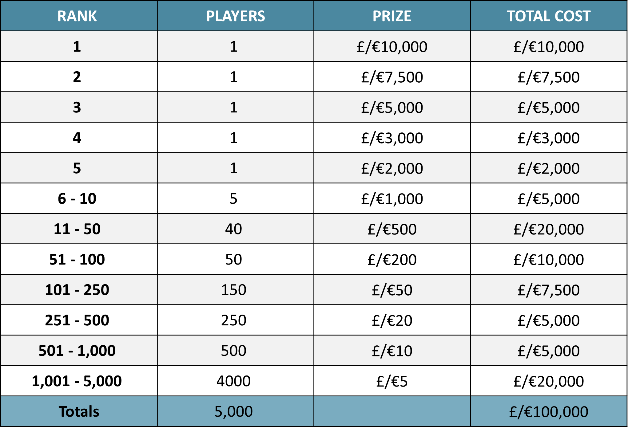 Participating players will be eligible for fixed cash amounts as detailed in the prizes table below.